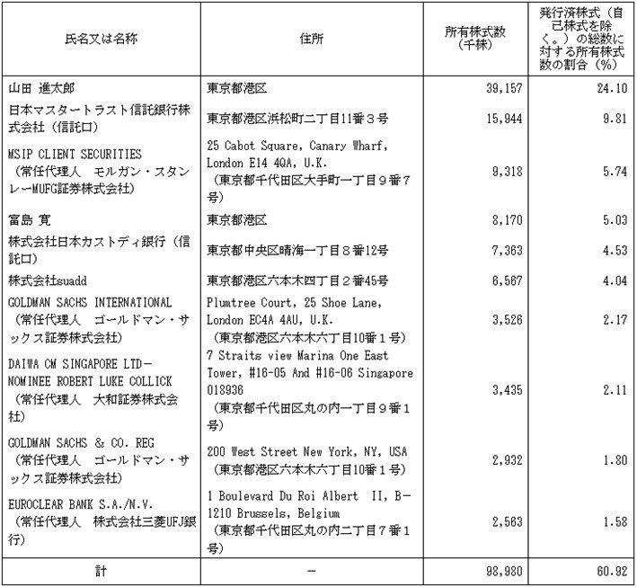 こういう会社によくある株主構成ですね。安定株主は山田CEOと共同創業者?の富島氏くらいですね。しかしだからと言って、メルカリに株主提案をしてもすんなりと可決できるわけではありません。国内機関投資家は基本的に現経営陣を支持する傾向がありますし、個人株主は議決権を行使しないか、白票で投じる(=会社議案に賛成、株主提案に反対)可能性が高いからです。否決される可能性のほうが高いでしょう。