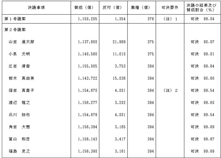 定時株主総会での株主提案権を有していないものの、このような活動がメルカリ山田CEOの役員選任議案の賛成率にどれくらい影響を与えるのか?ちなみに昨年の山田CEOの賛成率は以下の通り98.07%です。もちろん現時点で田端氏は山田CEOの選任議案に反対するよう呼び掛けている訳ではないので、賛成率には影響がないかもしれません。