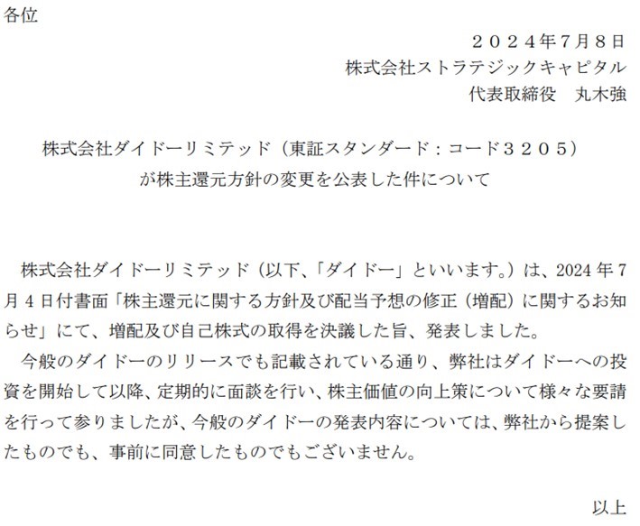 というのも、露骨すぎるでしょ?今回の大規模株主還元で丸木さんは全株売却したわけですが、事前に出したプレスでは以下の通り「今般のダイドーの発表内容については、弊社から提案したものでも、事前に同意したものでもございません」とおっしゃっています。さすがに丸木さんも「うちがやれって言ったんじゃないよ!売り抜けのために会社にやらせたんじゃないよ!」と主張しています。絶対に批判されるとわかっていたんでしょう。そりゃそうです。あれだけダイドーリミテッドに「本業を立て直せ!」と言っておきながら、ソッコーで売り抜けたんですから。さすがに「オレがやらせたんじゃない!」って言っておかないとまずいです。