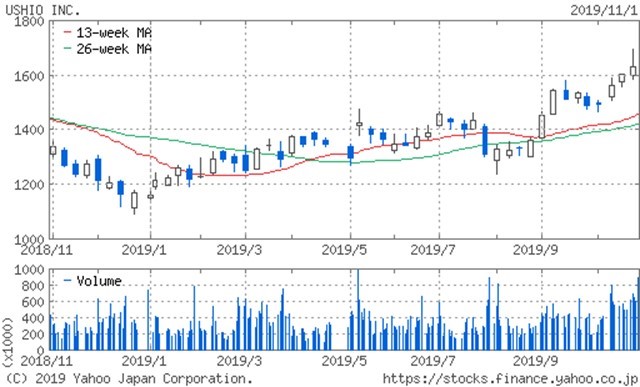 シルチェスターがウシオ電機の変更報告書を提出し、保有割合が10.58%から9.49%に低下しました。最近1年間のウシオ電機の株価は以下のとおりです。