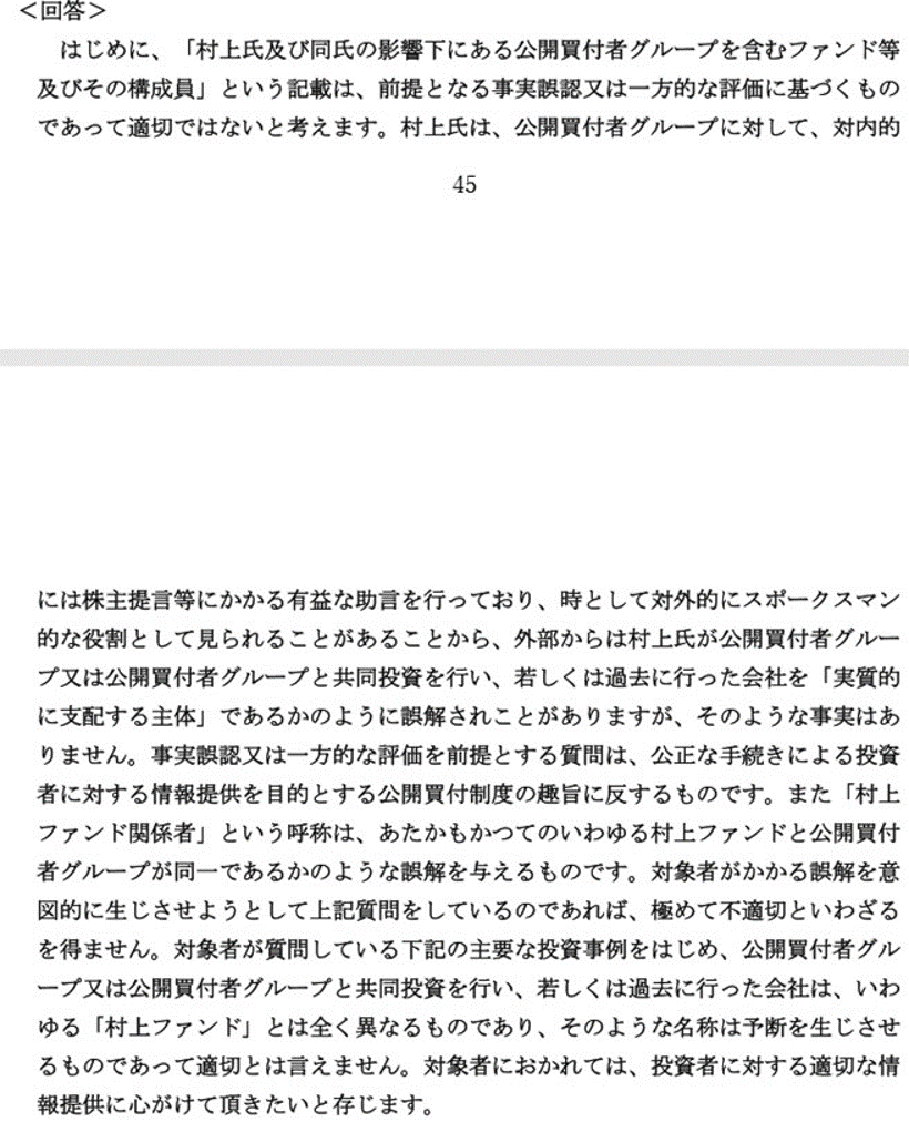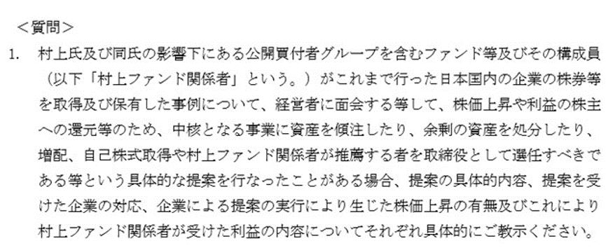 呼びやすいし、一般の方にとっても「あ、村上ファンドね」と理解しやすいのでこれまで当HPでは「村上ファンド」とk称していました。特段の他意はありません。ただ、今回の東芝機械への対質問回答報告書を見ると、以下のことが書かれています。まずは東芝機械の質問です。