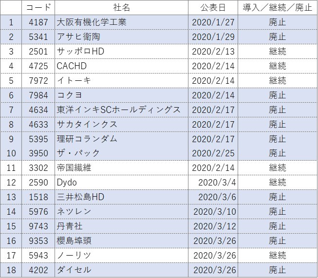 2020年にはいってからの買収防衛策導入・継続・廃止の状況です。廃止する会社が多いですね。いずれ株主構成を分析しますが、これらの会社は3年前の2017年に買収防衛策が必要と考えて更新した会社です。しかし今回は廃止している企業もあります。