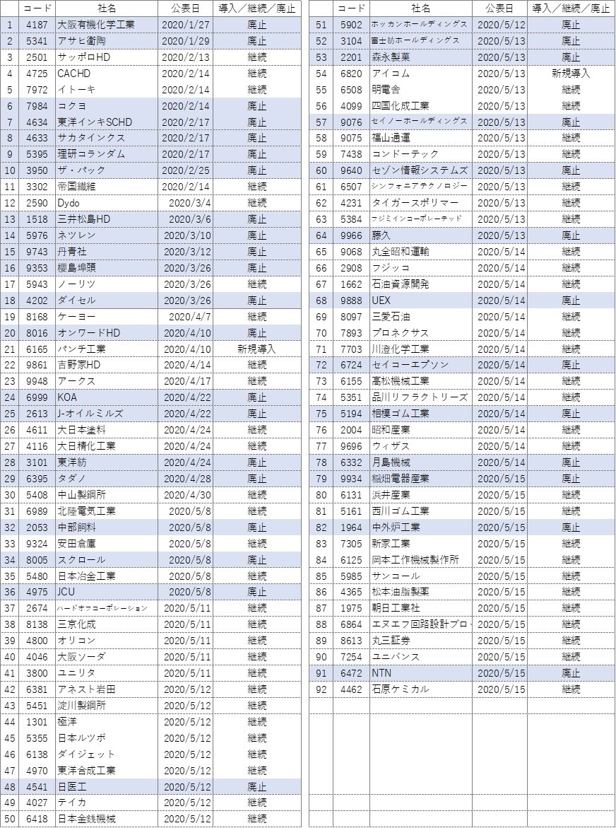 継続56社、新規導入2社、廃止34社です。抜け漏れがある可能性につきご了承ください。