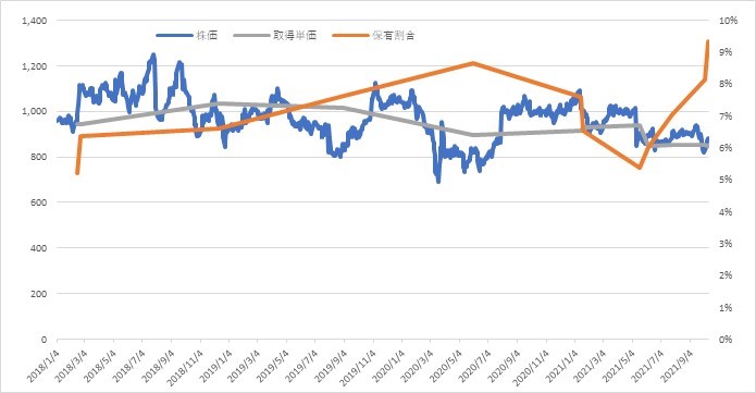 保有株数5,789,300株、取得資金の総額約49億円なので、1株当たり850円で取得していることになります。