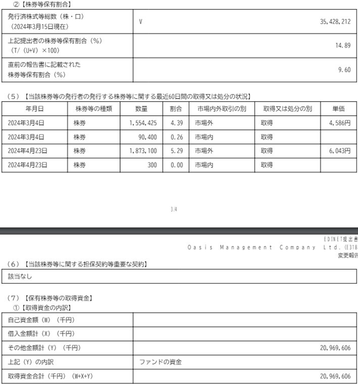 オアシスアインHDの変更報告書を提出しました。保有割合は一気に9.60%から14.89%に上昇しました。
