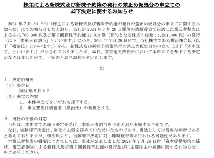 株主による新株式及び新株予約権の発行の差止め仮処分の申立ての却下決定に関するお知らせ