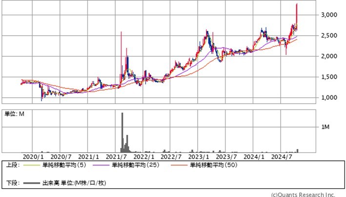 最近5年間の株価は以下の通りです。まあTOB価格は高いですね。