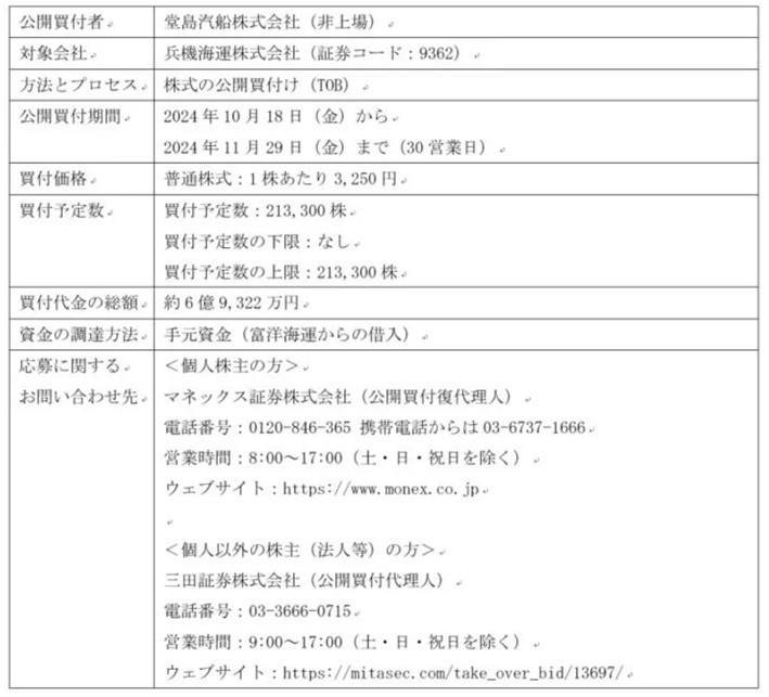 資本業務提携の提案をしたけど断られた、TOB開始前に接触するメリットもないので、兵機海運との事前協議なくTOBを仕掛けた、ということです。敵対的・同意なきTOBですね。TOBの条件は・・・以下をみるのがわかりやすいですね。