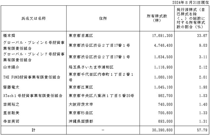 以下はベースフードの大株主です。メルコ牧社長の保有割合は29.05%なので、筆頭株主の橋本氏33.67%に近づいていますね。