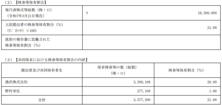 で、共同保有者を見たところ、以下です。野村幸弘氏というのは、野村絢氏、つまり村上世彰氏のお嬢さんの旦那さんです。