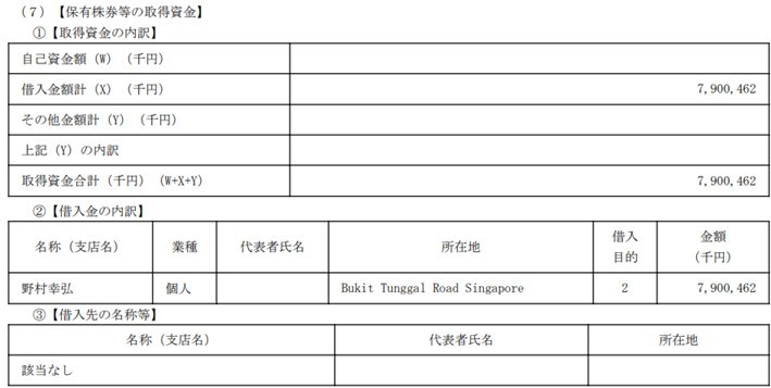 湯沢の取得資金の内訳を見ると「借入金合計(千円) 7,900,462」となっており、借入金の内訳として野村幸弘氏の名前があがっています。野村幸弘氏から借り入れているようですが、おおもとの資金の出どころは野村絢氏かもしれません。