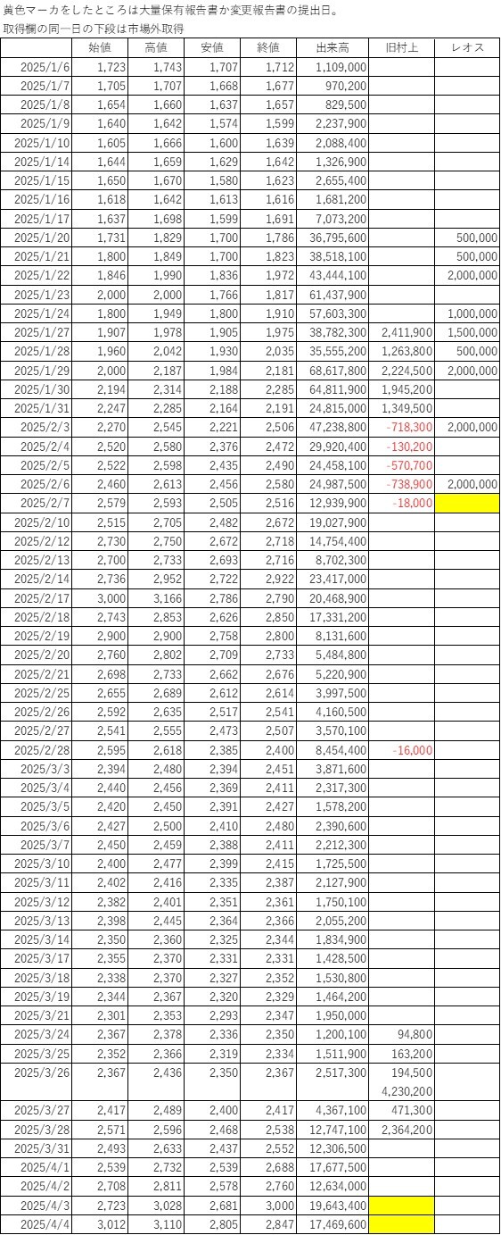 一方、4月4日は高値では4月3日の終値を上回っているものの、終値ベースでは下回っています。相場環境の影響もあったのかもしれませんが、あまり旧村上ファンドの登場が株価に反映されているような感じではないですね。マーケット参加者の皆さんはあまり旧村上ファンドに期待していない???「どうせすぐ売り抜けるんだろ?」と思っている???さてまた変更報告書が提出されるでしょうか?