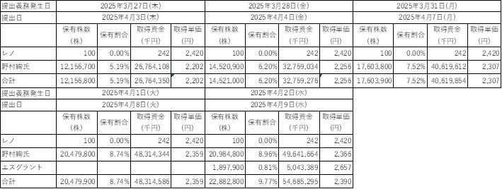 次回からかな?と思っていたのですが、今回から加わりました。おそらく野村絢氏がそのまま買い続け、総議決権の10%以上になると「主要株主」となります。主要株主になった場合、以下のような制約が発生します。基本的に旧村上ファンドは各社で10%以上持つことはあまりありません。