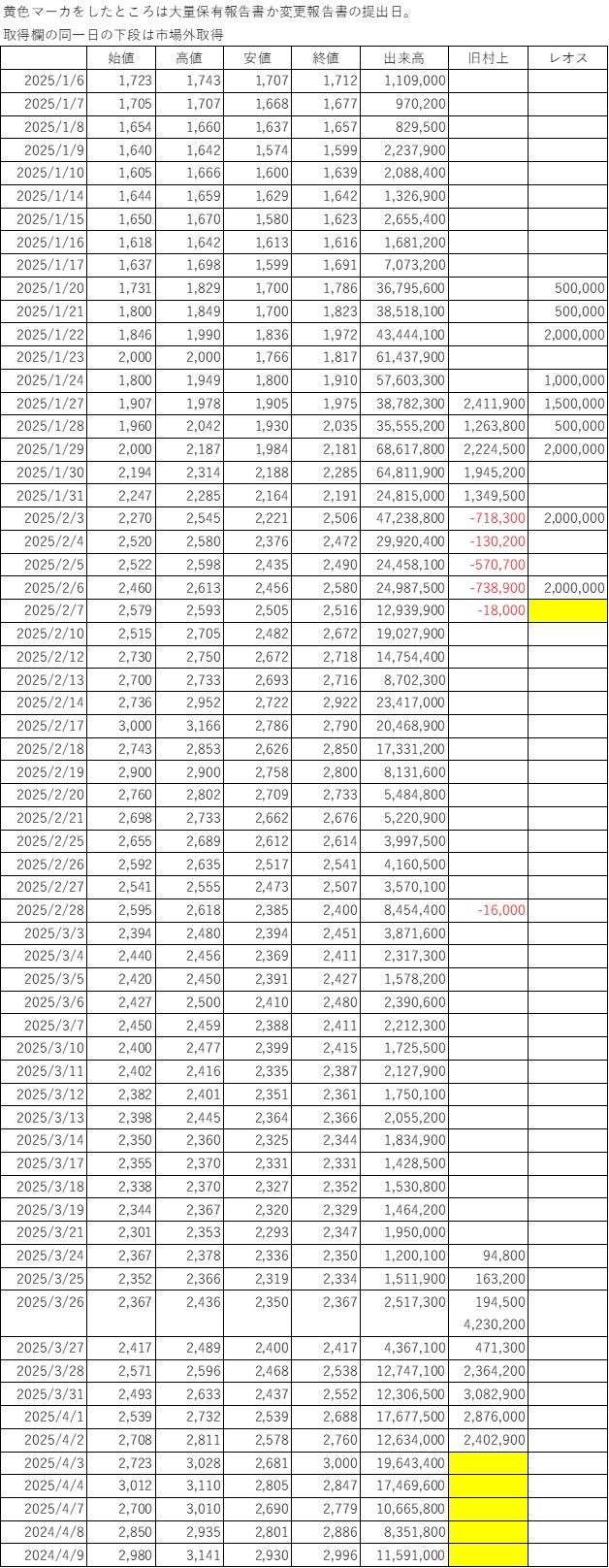 そして明日4月10日に変更報告書が提出されるかどうかですが、おそらく提出されるのではないかと想像します。旧村上ファンドが初めて大量保有報告書を提出したのは4月3日の16:00ですから、旧村上ファンドの登場が株価に反映されたのは4月4日からです。4月3日の取引時間は旧村上ファンドの登場が明らかになる前なので、もしかしたらこの日を最後に買っているかもしれませんね。