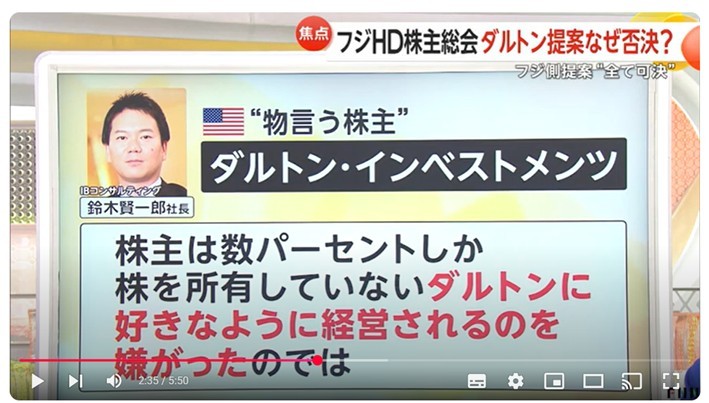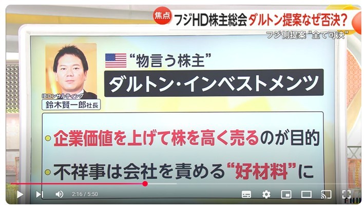 以下の通り、フジMHDの株主総会の結果やダルトンの行動に関して、フジテレビさんに取材をしていただきました。顔&コメント出演させていただきました。お時間あるときにご覧いただけると幸いです。