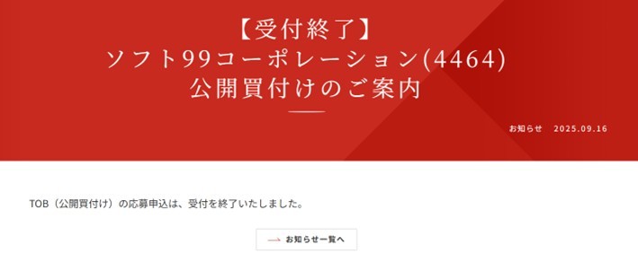 ソフト99のMBOとエフィッシモの敵対的TOB、それぞれ本日が延長されたTOBの最終日だったのですが、以下の通り、エフィッシモのTOB代理人である立花証券のHPを見ると「受付終了」となりました。