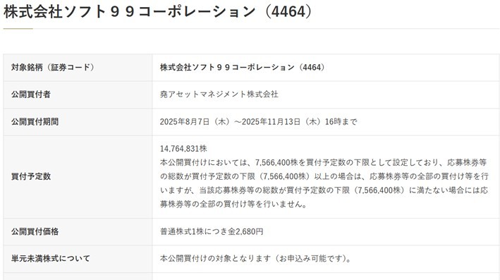 エフィッシモのソフト99に対するTOBが受付終了