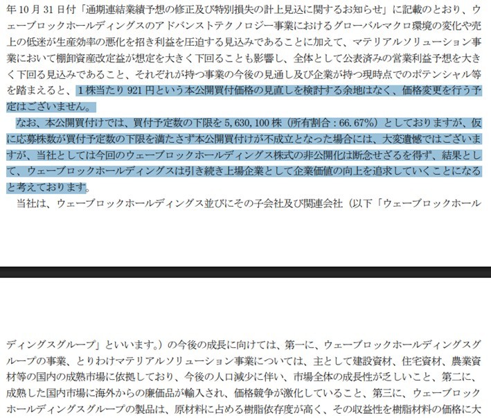 ご丁寧に「WHD 株式会社によるウェーブロックホールディングス株式会社株式(証券コード:7940) に対する公開買付けに係る WHD 株式会社の考え方に関するお知らせ」というプレスを出し、公開買付者の考え方を公表しています。