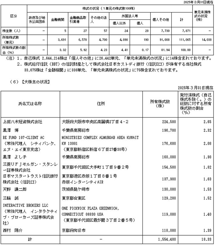では次、平和不動産。これは保有割合が減少しています。10.39%から9.38%です。おめでとうございます・・・ってほどでもないですね。安くなったらまた買い増しされそう。平和不動産は常に誰かに狙われている印象です。安定株主比率も低いですから。