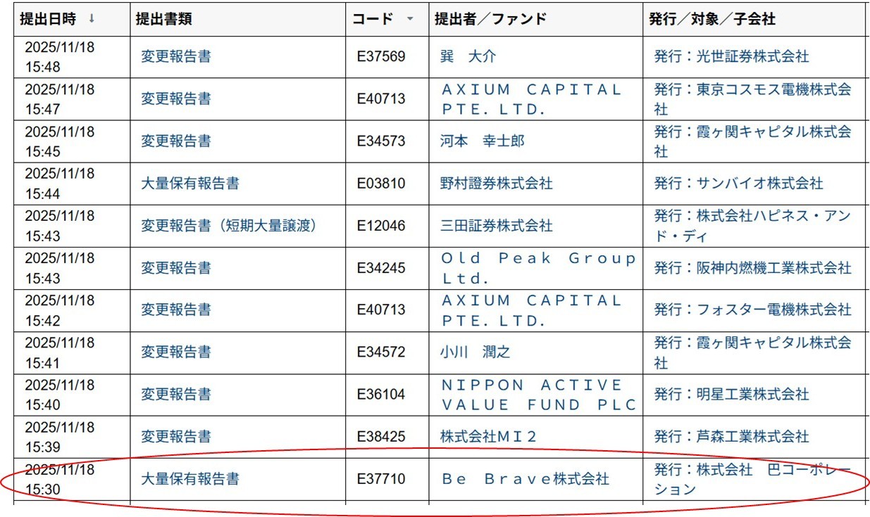 以下をご覧ください。さっき巴コーポレーションの大量保有報告書が提出されました。