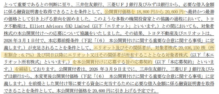 なお、公開買付者が 2026 年2月2日に公表した「株式会社豊田自動織機の株券等に対する公開買付けに関する方針について」に記載のとおり、公開買付者は、本公開買付価格が対象者の本源的価値を反映した最善の価格であると考えており、かつ、本公開買付価格を変更する意向を有しておりません。公開買付者は、本公開買付価格は、トヨタ不動産が 2025 年6月3日に公表した「株式会社豊田自動織機の株券等に対する公開買付けの開始予定に関するお知らせ」に記載の買付価格 16,300 円を基に、同日以降の対象者を取り巻く事業環境の変化や対象者が保有する上場株式の株価上昇などを勘案した上で、対象者及び本特別委員会との間における複数回に亘る真摯かつ十分な協議を重ねて決定した価格であり、対象者の本源的価値を反映した価格であると考えております |