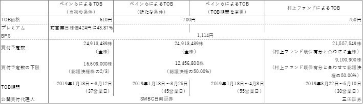 もう皆さん、村上ファンドにカウンターTOBを仕掛けられている廣済堂のことなど忘れてしまったのではないでしょうか?以下、ベインらのMBOと村上ファンドのTOB条件を比較します。