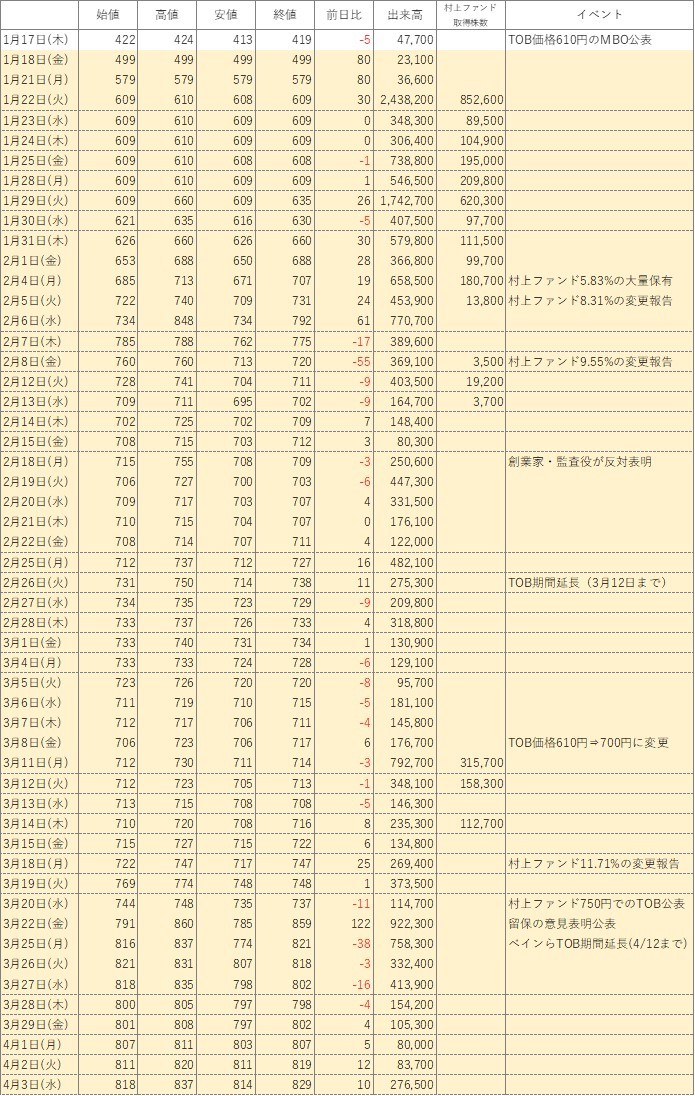 ここ数日の株価は上がっていますね。ベインらのTOBの最終日が近づくにつれて、価格引上げの期待が高まっているのでしょうか?ベインらが価格を引き上げなければ、今ついている株価も下がっていくでしょう。750円超で買った株主は損失を最小限にするために村上ファンドのTOBに応募するかもしれません。