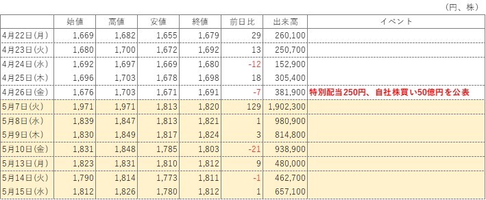 特別配当や自社株買いの公表を受け、5月7日(火)から出来高が急増しています。マクセルHDが特別配当や自社株買いをする狙いは、当然、村上ファンドに退出してもらうことでしょう。村上ファンドが退出するとしたら、出来高が急増した5月7日(火)にある程度まとまった株式を売却する必要があり、そうした場合、昨日には変更報告書が提出されてもおかしくないのですが、実際には提出されていません。