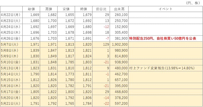 村上ファンドから変更報告書は提出されていません。100%村上ファンドは特別配当の公表を受けても、1株も売却していないと言い切ってしまってよいでしょう。マクセルは特別配当の公表、株価大幅上昇、村上ファンドが市場で売却・Exitという絵を描いていたのでしょう。しかし失敗に終わりました。