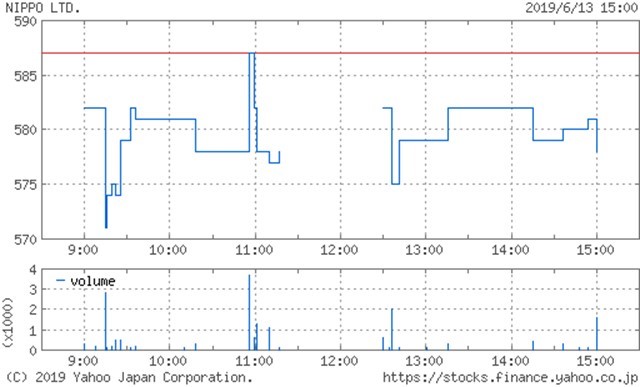 本日、フリージア・マクロスが日邦産業の変更報告書を提出しました。すでにお伝えしました通り、保有割合は18.69%から19.68%に上昇しました。本日の株価推移は以下の通りです。