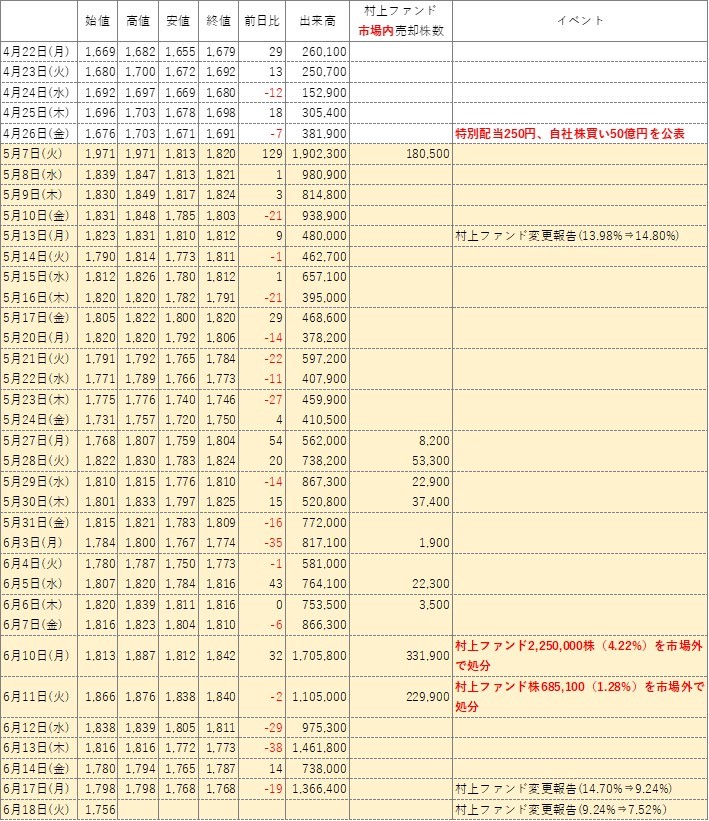 昨日に続き、村上ファンドが本日6月18日にマクセルの変更報告書を提出しました。保有割合は9.24%から7.52%に低下しました。保有株数は4,013,900株です。マクセルの発行済株式総数は53,341,500株であり、5%に相当する株数は2,667,075株ですから、あと4,013,900株-2,667,075株=1,346,825株売ってしまえば変更報告書の提出義務はなくなります。もしかしたら、6月12日~14日の間でも市場外で売却している可能性も否定できませんね。