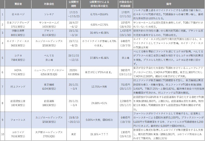 最近日本で起きた敵対的TOBは以下のとおりです。