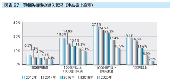 東証のコーポレート・ガバナンス白書2021が以下のとおり公表されています。P30~32において「買収防衛に関する事項」がまとめられていますが、非常に興味深いデータがあります。これは当社のお客様からご指摘いただきました。ありがとうございます。