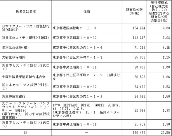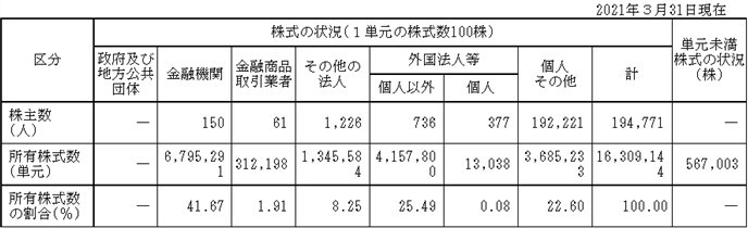 外部から見た安定株主比率は、その他の法人8.25%⇒議決権ベースだと8.41%、日本生命4.45%、大樹生命2.25%、全国共済農業協同組合連合会1.66%、三井住友銀行1.50%の合計18.27%です。議決権ベースで見ると、外国人株主26.06%、個人株主21.14%です。上位に出てこない安定株主を足しても、おそらく安定株主は20%~22%くらいかなと思います。