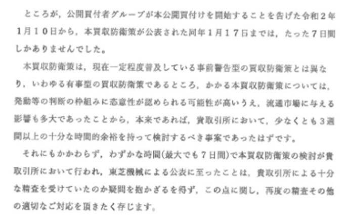 そもそも東証の審査は開示審査が中心だったと思うので、有事型だから慎重に3週間以上の時間的余裕をもって検討すべきかどうかはわかりませんね。ただ、有事型買収防衛策で対抗している企業は東証に事前相談をしているんですかね?していないのだとしたら、ちょっと問題ではないでしょうか?平時型は事前相談が必要だけど有事型は必要ないという理屈はおかしいと思います。まあ、もちろん有事型の事前相談で審査に3週間もかけられたらたまったもんじゃありませんけどね。