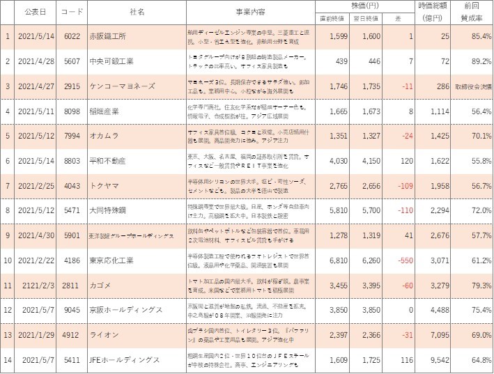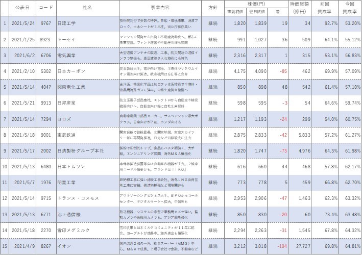 一言でいうと「えー加減なこと言うな!」ですね。今年買収防衛策を継続した会社の株価の状況を見てみましょう。公表直前の株価終値と翌営業日の株価終値です。※15:00以降に公表した場合は公表日終値と翌営業日終値を比較しています。15:00より前に買収防衛策の継続・導入を公表した場合は、前営業日の終値と公表日の終値を比較しています。