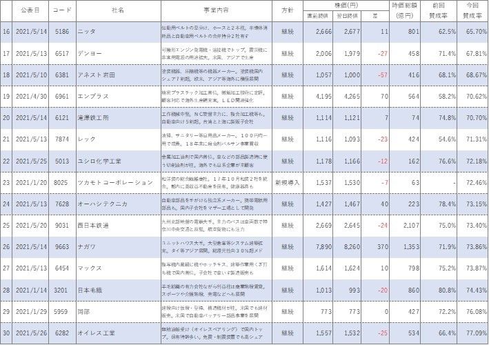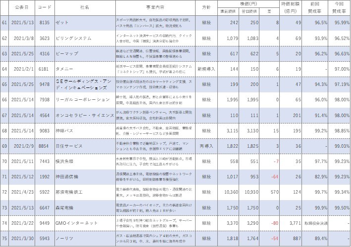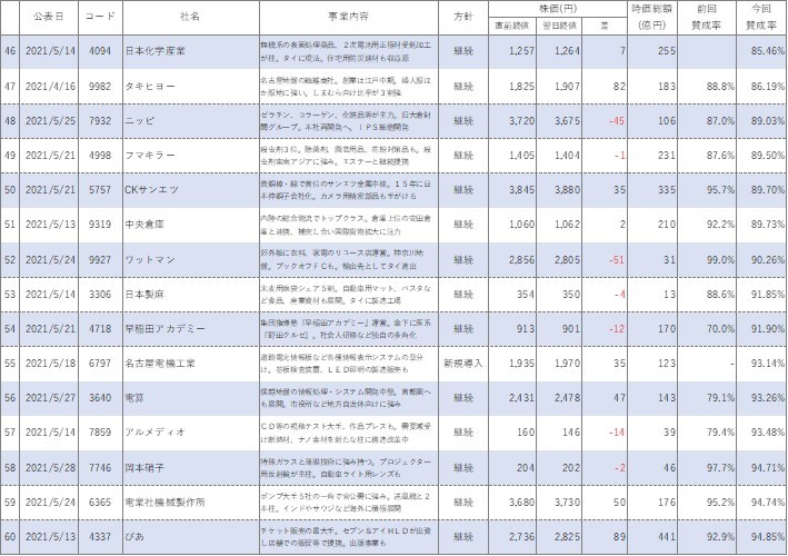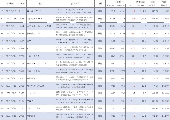 以前コラムでまとめましたが、2021年1月~6月において買収防衛策を継続(新規導入含む)した会社は75社で、廃止した会社は14社です。継続した会社75社のうち、買収防衛策継続公表直前の株価を終値ベースで比較して下がったのは35社です。廃止企業だと14社中、下がったのは7社です。割合で言うと株価が下がったのは継続企業のうち46.7%、廃止企業のうち50%ということになり、廃止企業のほうが下がった企業の割合が高いです。まあ、廃止企業の数が今年は少ないので、これだけをもって廃止したほうが株価が下がるなんてことは言えないのはわかっています(笑)