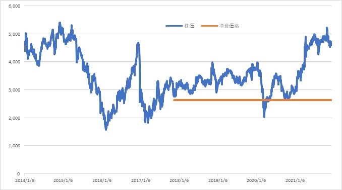 経営陣自らが東芝を解体する道を選択したにもかかわらず(それが企業価値向上にプラスかどうかは置いといて)、それでもアクティビストが「3分割で株価が上がるんかい!今すぐ上がる策を提示せんかい!」と言っています。もう一度、第三者割当増資の価格と株価の推移を見てみましょう。