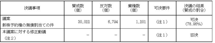外部から見た安定株主比率ですが、その他の法人4.14%、損害保険ジャパン5.72%、三井住友銀行4.85%、みずほ銀行2.43%、住友生命1.58%の合計18.71%です。低いですねえ。これだと否決されますかね?では、今回の対抗措置発動議案の賛成率を見てみましょう。