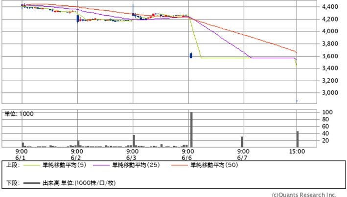 IRジャパンの株価です。連日のストップ安です。注目したいのは6月6日の株価です。