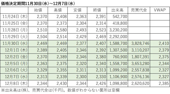 価格決定期間中のVWAPは以下のとおりです。たしかに11月25日の自己株TOBの公表受けて、28日の株価は高値で2,580円を付けました。しかし安値は2,493円です。この時点でマーケットはこの奇策を問題点を見抜いていたのでは?そしてその問題点とは「村上さんを追い出すために実質プレミアムをつけたもの」とか「株主還元に目覚めたわけじゃない」というものではなく、単に「この条件下でジャフコ株を買っても、自己株TOBの価格が公表された瞬間に損する」というものではないでしょうか?