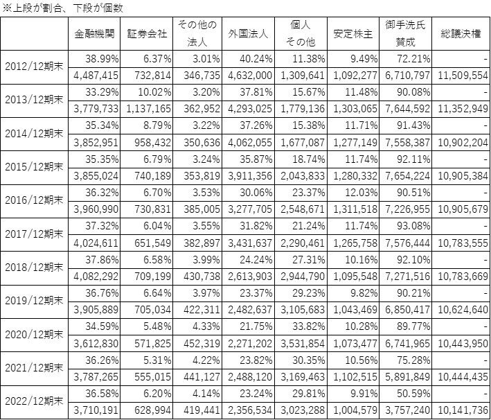 2013年3月総会(上表だと2012/12期末の株主構成が該当)において御手洗さんの賛成率が72.21%になってしまいました。その要因は以下のとおりだと思われます。