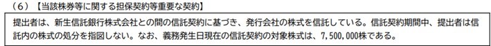 上記とほぼ同じ内容なのですが、この時点では「信託契約期間中、提出者は信託内の株式の処分を指図しない」とあったのですが、上記15:34に提出した変更報告書では記載がなくなりました。