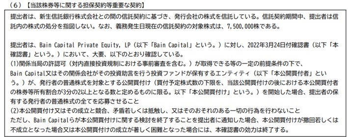 ・2023年8月23日に提出した変更報告書では、ベインによるTOBが実施されたら応募すること、ジャマしないこと、ベインがTOBの検討終了を通知したら確認書の効力は終了、といったことが書かれていた。