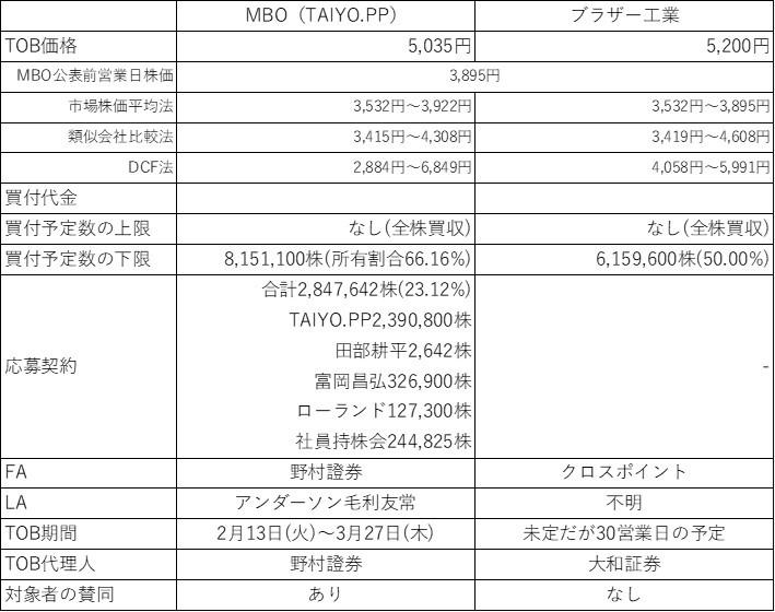 MBO=フィナンシャルバイヤーによる買収、ブラザーのTOB=ストラテジックバイヤーによる買収なので、冷静に考えたらブラザーが勝つことはまず間違いありません。MBOを実施する側がブラザーが出てきたからと言って「よっしゃ!ほな価格引き上げじゃ!」って節操ないことできないでしょ?「だったら最初に提示した5,035円はなんだったんだ?不当に安い価格でMBOをしようとしてたのか?」ってなります。引き上げる理屈がないわけじゃないでしょうけど。それにブラザーはストラテジックバイヤーですから、ローランドDGとのシナジーをTOB価格に織り込めます。MBOはフィナンシャルバイヤーですから基本的には織り込めません(TAIYOが株を持っている先とのシナジーなどを訴えることは可能かもしれませんが、そういう先があるのかどうか)。なのでブラザーが勝つのはまず間違いないでしょう。