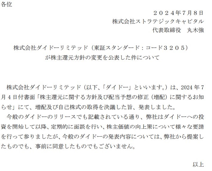 以下、昨日ストラテジックキャピタルが公表したプレスリリースです。