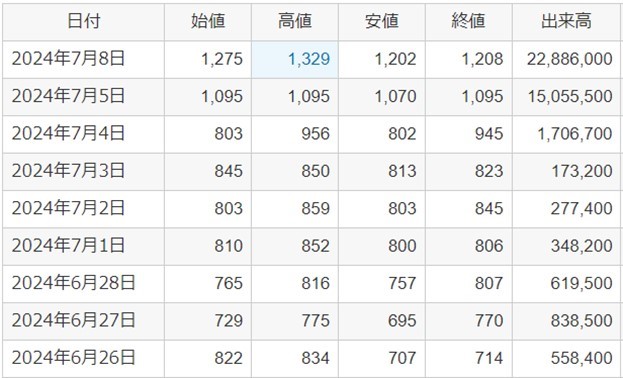 なお以下はダイドーリミテッドの株価・出来高です。大規模株主還元を公表したのは7月4日で、7月5日(金)と7日(月)の出来高は相当あります。