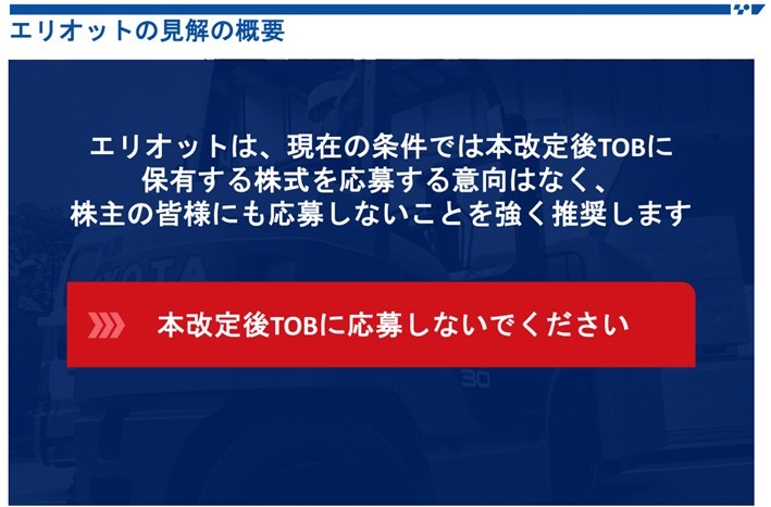 株主のためでもある、よかれと思ってやったのに、応募するな、と言われています。これまでつけたことない価格である16,300円を提示したら、日経のリークのせいで市場株価を下回ってしまい「ディスカウントTOBだ!」と言われてしまいました。ただただばくち打ちが失敗しただけなのに。そして今度は「じゃあ18,800円にします」と言ったら、今度は「TOBに応募するな!」です(もちろんエリオットの言いたいことはわかりますが)。